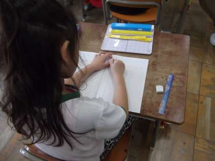 1年生の算数の授業です。「8+3」のけいさんのしかたを学習しました。さくらんぼ図を使い、10のまとまりを作って計算しました。