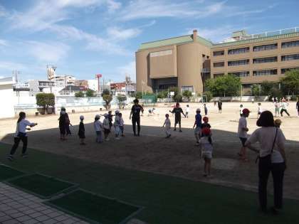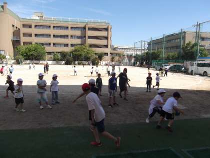 お昼休みには、1年生と5年生がドッジボールをしていました。5年生はゆっくりボールを投げて1年生に配慮しています。優しいですね。