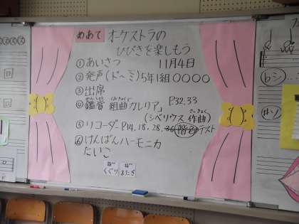 5年生の音楽です。今日は、組曲「カレリア」(シベリウス作曲)を鑑賞しました。オーケストラの迫力、ダイナミックさを感じました。
