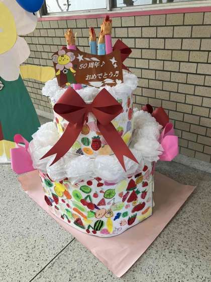 矢田北小学校の50周年を記念して、子どもたち全員でバースデーケーキを作りました。フルーツいっぱいのケーキが完成しました。