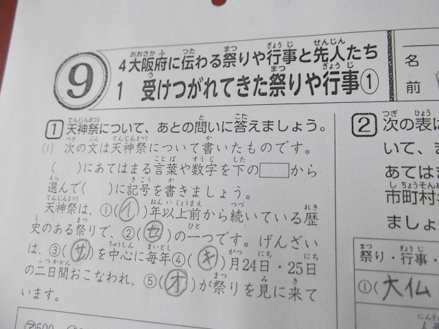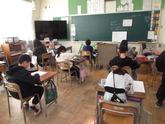 4年生の教室では、社会科のテストをしていました。「受けつがれてきた祭りや行事」の単元です。みんな全力で取り組んでいます。