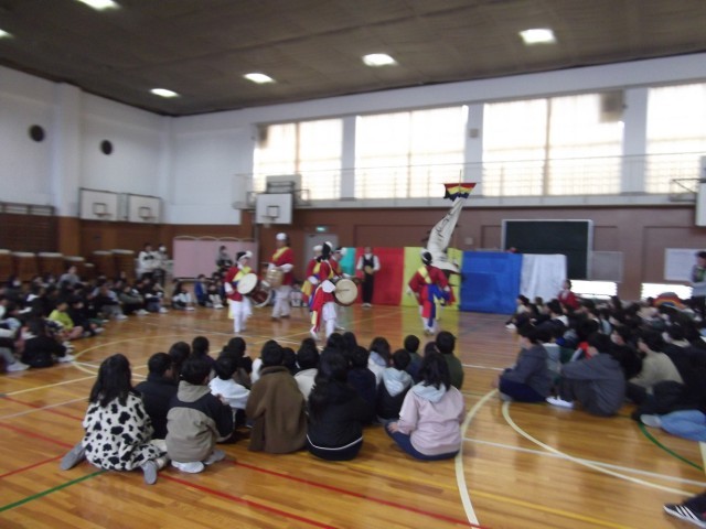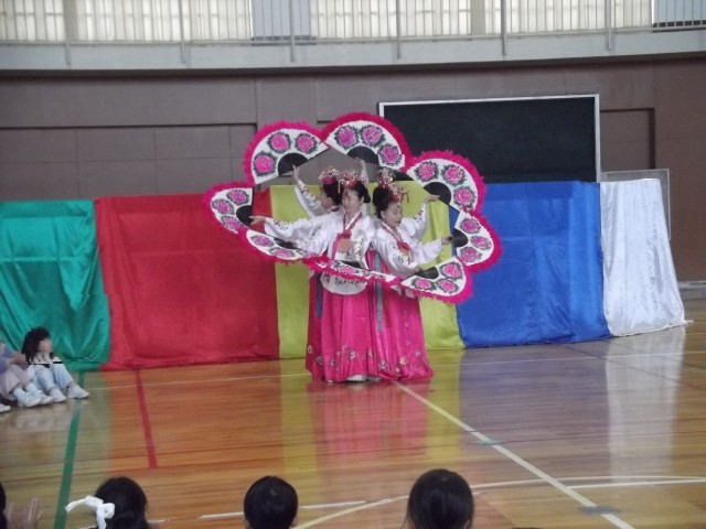 本日、チュモニ公演がありました。韓国・朝鮮の伝統芸能のプンムルノリやプチェチュム(扇の舞)、「うさぎの裁判」の劇を鑑賞しました。