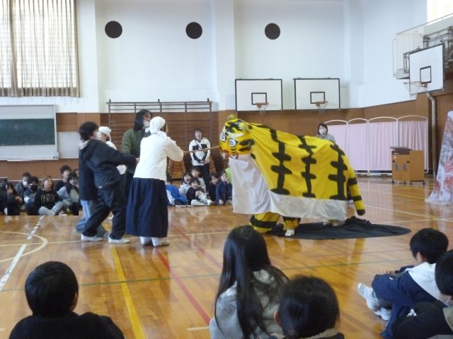 プンムルノリで使った4つの打楽器には、雷や風、雲、雨の音を表し、星、太陽、月、人の形を表していることも教えたいただきました。「うさぎの裁判」では、心を入れ替えたホランイ(トラ)を矢田北小学校の児童で助けました。(12月11日 記事)