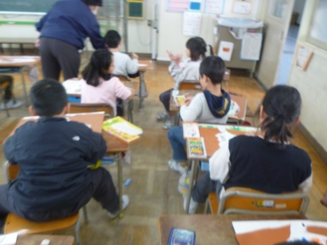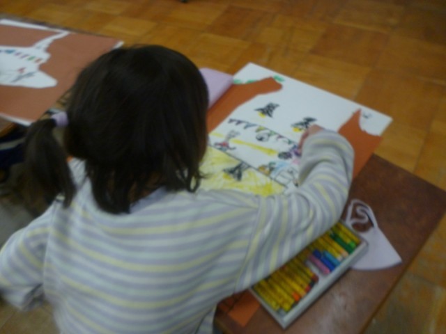 1年生の図画工作です。「おむすびころりん」をテーマに絵を描いています。ねずみやおむすび、花など、自分がイメージしたものを丁寧に描いています。
