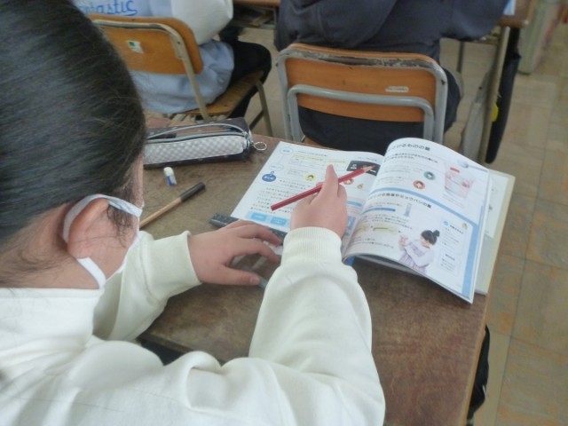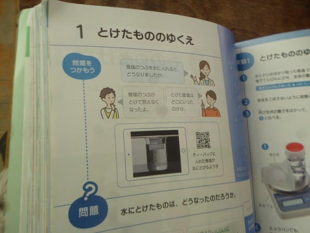 5年生の理科の学習です。「とけたもののゆくえ」の単元です。コーヒーシュガーなどがとけてあとにどのようになるか実験の後の確認をしていました。
