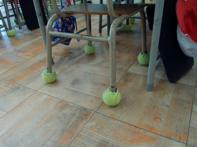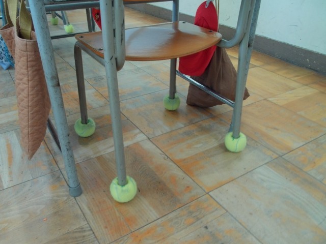 教職員で、教室の椅子に廃材のテニスボールをつけました。テニスボールをつけることで、椅子を引きずった時に起こる大きな音が軽減されます。廃材のテニスボールは、平野区の「テニスワールド平野」より提供いただきました。ありがとうございました。
