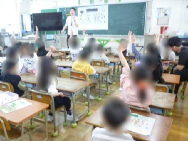 1年生は算数科「おなじ かずの なかまを さがそう」の学習をしました。教科書のイラストから動物や物をブロックに見立てて、同じ個数のグループを見つけます。先生からの質問に自ら挙手して、積極的に答える姿がたくさん見られました。