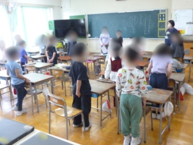2年生の「朝の会」の様子です。日直さんが2名、みんなの前に出て司会をします。まずは、みんなそろって大きな声で「おはようございます」と元気よく先生と朝の挨拶をすることができました。次に日直さんがスピーチをします。聞いていたお友達からの質問にもしっかりと答えることができていました。