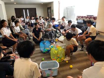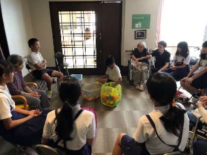 8月30日(金)の2時間目に、特別養護老人ホーム・ヴァンサンク東住吉に出かけ、ふれあい活動を行いました。施設の方と一緒に「おぼろ月夜」の歌を歌ったり、チーム対抗でミニ玉入れ大会を楽しんだりしました。