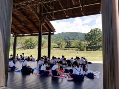 とても良いお天気で,オリエンテーリング中には水筒のお茶はみるみる減ってしましました。ゴールの橘寺からは川沿いの道をさらに歩いて,大きな屋根のある舞台でお弁当を食べたあと,石舞台の見学をしました。暑さの厳しい中,たくさん歩いて疲れましたがしっかり勉強してきました。