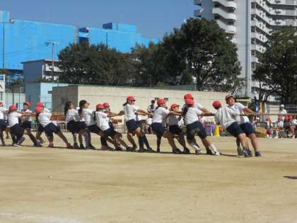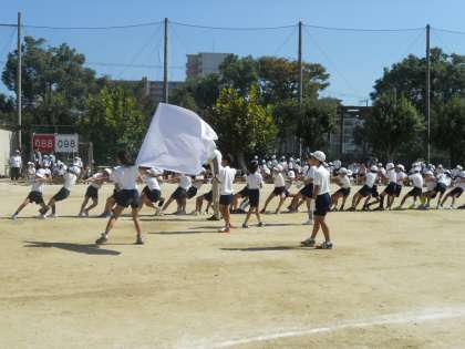 今年から初めて取り入れた全校児童による綱引きです。1・2年、3・4年、5・6年と順次行いました。そのあと、保護者・来賓・教職員が紅白に分かれて力比べです。児童は団体競技の一つとして実施し、得点にかかわるのでみんな必死の形相で力いっぱいがんばりました。