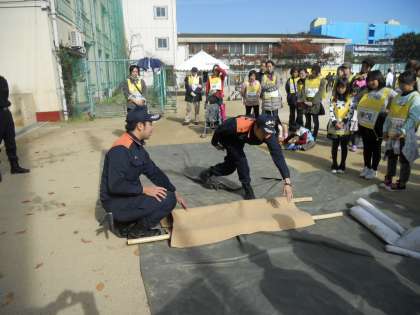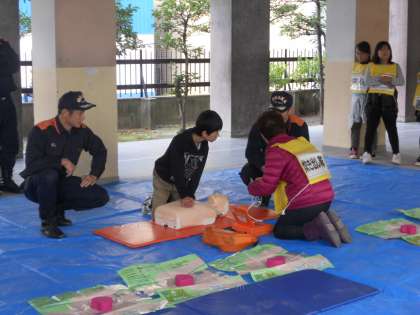 3つの訓練は、1煙のテントの中を逃げる・水消火器で火を消す 2負傷者搬送訓練 毛布と物干し竿で応急担架を作り、安全な場所に移動する 3応急処置訓練 倒れている人をどのように救助するのか・胸骨圧迫による心臓マーッサージ、AED使用時の注意、一人ではなくたくさんの人のリレーで救急車が来るまで続ける等を学びました。