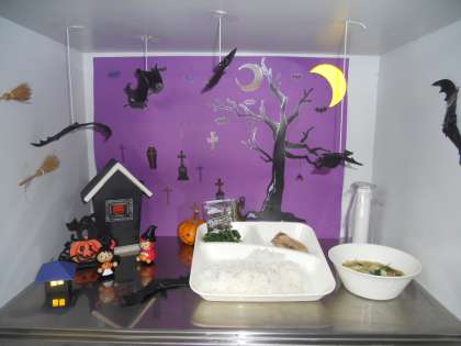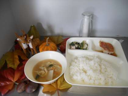 給食室の入り口の「今日の献立」展示には、毎月調理員さんが工夫を凝らし、季節を味わえるような飾りつけをしてくれています。先月はハローウィーン、今月は秋の味覚と見ているだけで楽しくなってきます。給食当番の子どもたちも楽しみにしています。さて、来月は何の飾りつけかな?