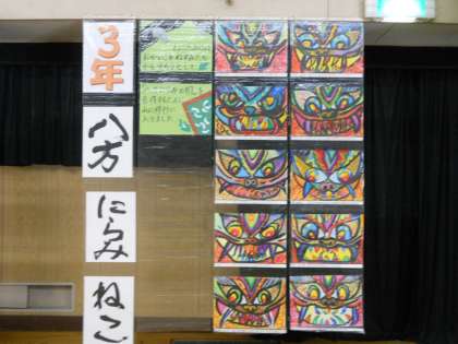 3年生の作品です。絵画は「八方にらみ ねこ」です。怖い目でにらんだり、牙に工夫を凝らしたりしています。立体作品は、商店街見学に行った経験を生かし、「湯里商店街」をみんながなりたいお店屋を作りました。それぞれの小さい商品にも丁寧さが溢れていました。