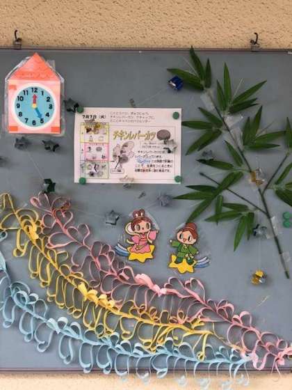 今日は七夕ですね。雨空が続いて天の川は見えそうにないので、給食の掲示板に給食委員たちが作ったキラキラ星を飾りました。