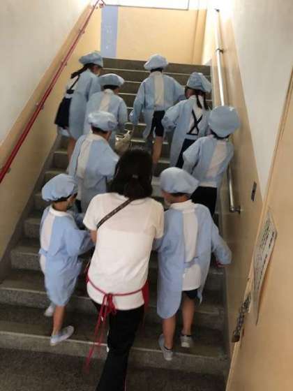 写真は2年生の給食当番が頑張って階段を昇るところです。