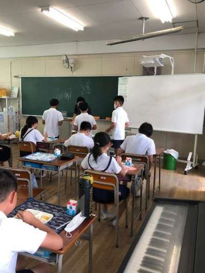 写真は6年生で、それぞれが距離をとりながら給食を食べています。