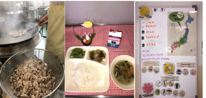 写真は、4年生が「いただきます」をしているところと、豚バラ肉を茹でている調理中のものです。人数の多いクラスですが、それぞれが自分の役割をスムーズにこなしています。