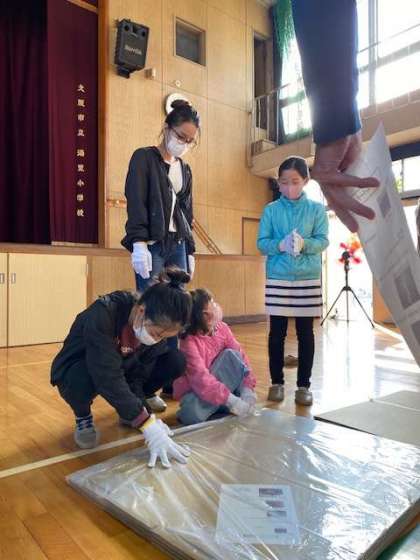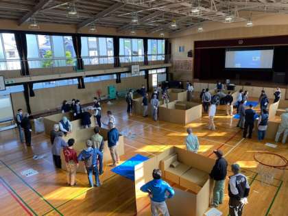 避難時に活用できる、段ボールを使った「楽々ベッド」を組み立て、体感しました。