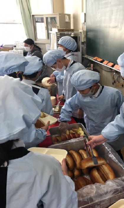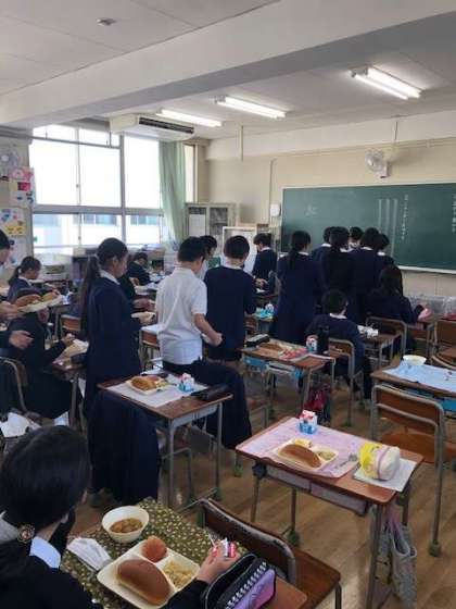 写真は5年生が配膳しているところと、ミートボールと野菜のカレー煮のおかわりに並んでいるようすです。カレー煮は人気の献立で残食もありませんでした。
