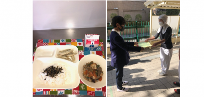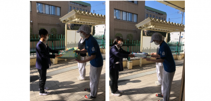 今日から給食週間です。調理員さんに各クラスが「感謝状」を作りました。写真は給食委員会6年生が代表して渡しているところです。