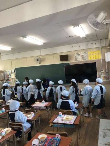 写真は3年生のいただきますと、親子丼のおかわりに並んでいるようすです。全クラス、完食でした。