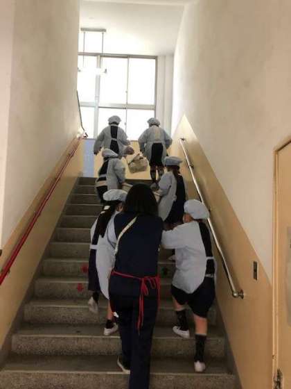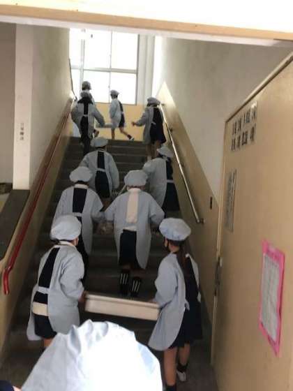 写真は2年生の給食当番が階段を昇っているところです。