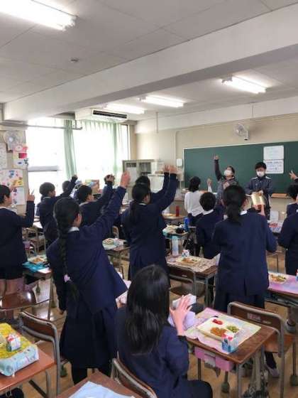 写真は5年生で「いただきます」と、いちごのおかわり希望者と先生がジャンケンをしているところです。