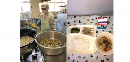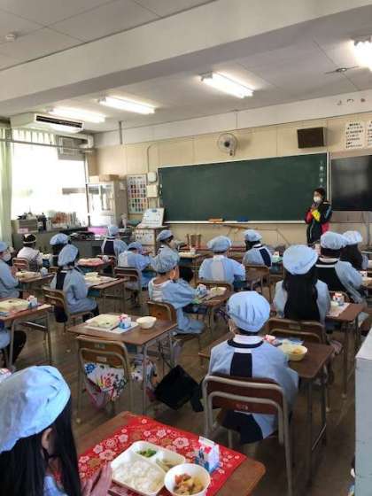 写真は3年生が先生の掛け声で「いただきます」をしています。