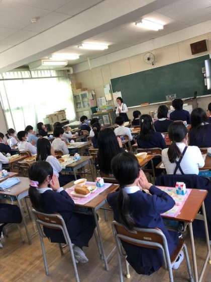 写真は5年生の「いただきます」とおかわりに並んでいる、給食時間のようすです。