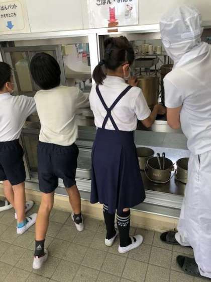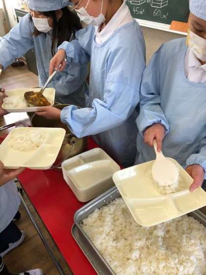 写真は5年生の配膳と給食当番が返却しているようすです。