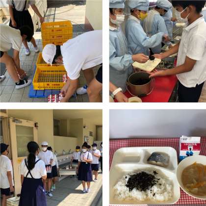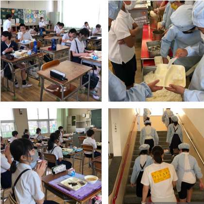 給食室から4階の教室まで給食当番が協力して運んでいます。