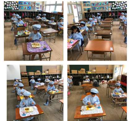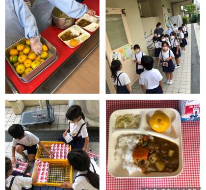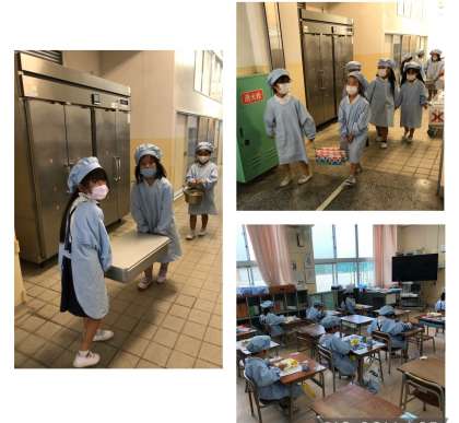 写真は1年生の給食時間です。当番は協力してバランスよく持ち、教室まで運んでいました。