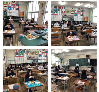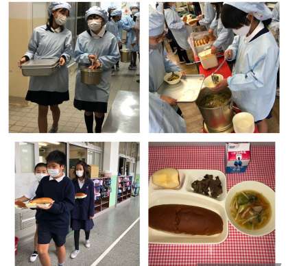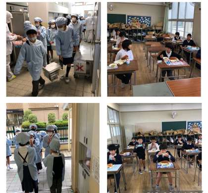 写真は5年生です。おかわり希望者が手をあげて配膳を待っています。