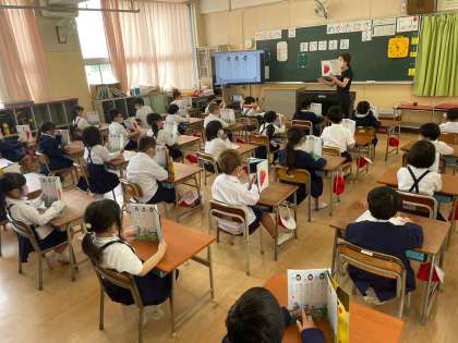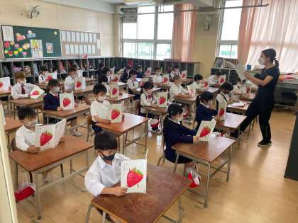 【あいうえおのうた】を音読しています。マスクをしっかりして、大きな声を出して楽しそうに音読していました。