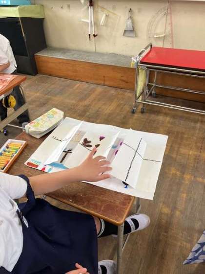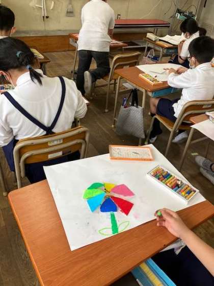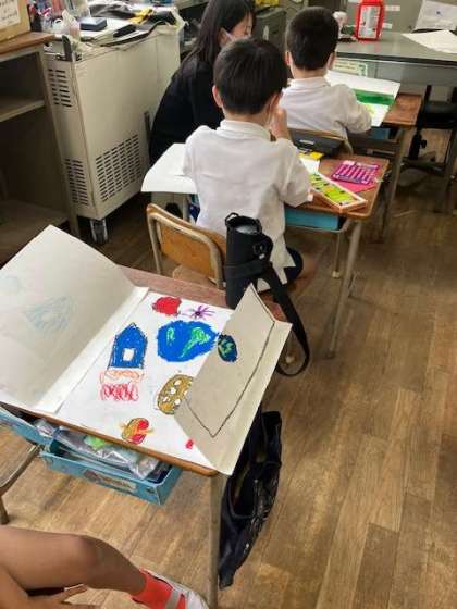 図画工作科で「ひらいて広がる ふしぎなせかい」の絵を描いています。「木の世界」や「宇宙の世界」「花の世界」いろいろな世界を楽しみながら、描いています。