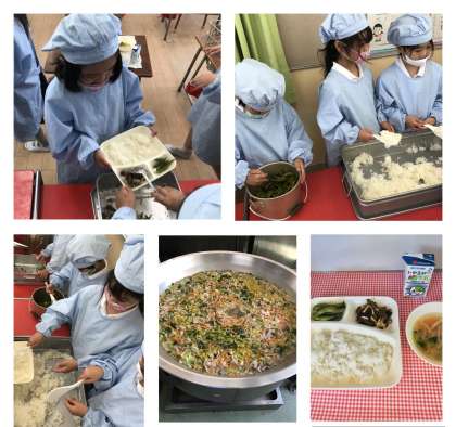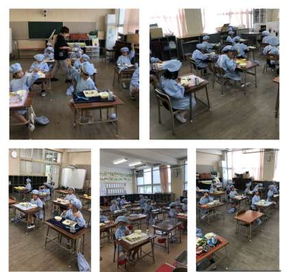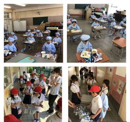 給食室から教室まで力を合わせて食器やおかずを運び、配膳も上手にできるようになりました。