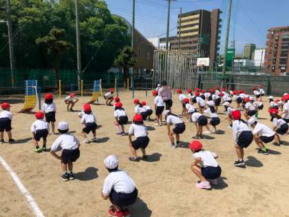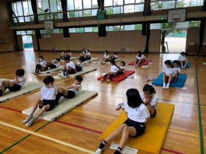 写真は上体起こしを行う6年生と、50m走前に入念に準備体操をする1・2年生の様子です。
