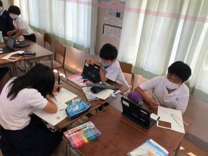 タブレットを活用しながら、6年生は国語科の学習でポスターを作っています!