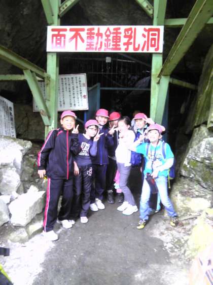 霧雨が降ったり止んだりする中、面不動鍾乳洞を目指してハイキングに出発しました。急な勾配を登って行くと、町が眼下に広がっています。子供達はヤッホーと何度も叫んでいました。面不動鍾乳洞の中は、ひんやりとしています。昨年と比べるとかなり整備されていて、照明や表示も工夫されています。