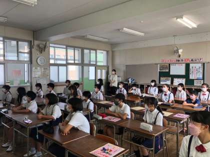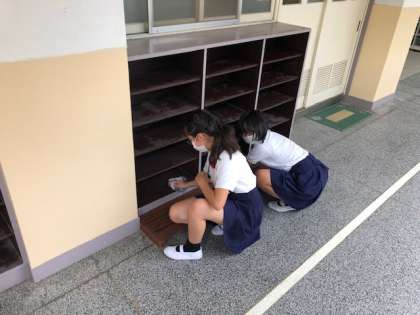 1枚目の写真はTeamsでの始業式で、校長先生の話を聞いている様子、2枚目は校内の清掃に励む姿の写真です。