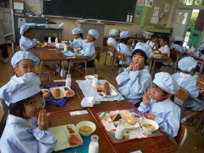 1学期も終わりに近づいてきました。暑さとともに食欲も落ちてきがちですが、湯里小学校の児童はとても元気いっぱい、食欲も旺盛です。今日も、おかわり!スイカもおかわり!