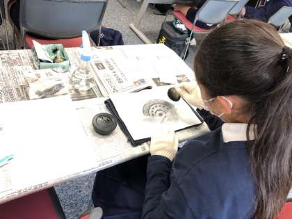 歴史博物館では展示見学はもちろん、瓦の拓本体験にも挑戦しました。