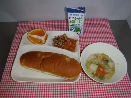 牛ひき肉と大豆(粒状)を炒めてケチャップ、トマトピューレなどで味付けしたミートソースに、とうふを加えてグラタンにしています。