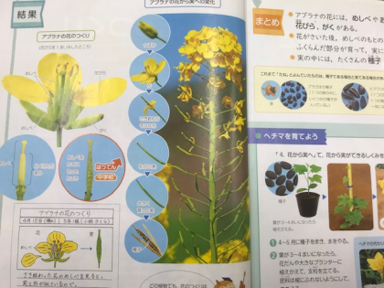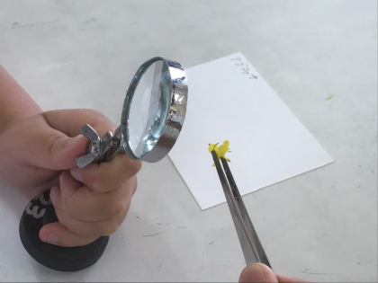 アブラナの花を1つとり、虫眼鏡でよく観察しています。