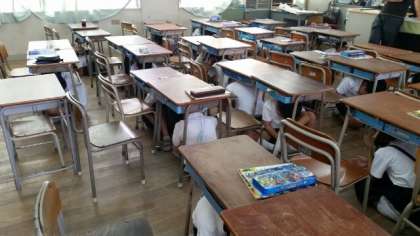 9月4日に実施しました、大阪880万人訓練の学級での様子です。11時の地震発生の合図とともに、全員机の下にもぐり、体に落下物が当たらないようにしました。次の大津波警報発令時には、どのような行動をとらなければならないのかをしっかり覚えました。