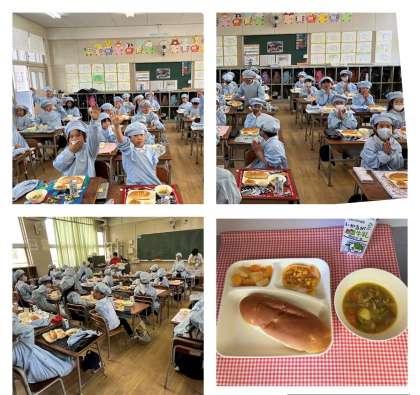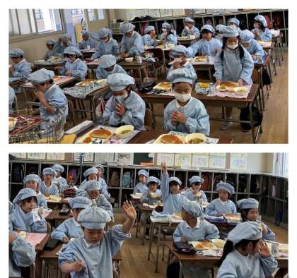 きょうざの皮にピザソース、チーズ、ツナ缶などを乗せてオーブンで焼いたピザ風の献立です。