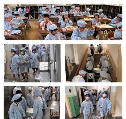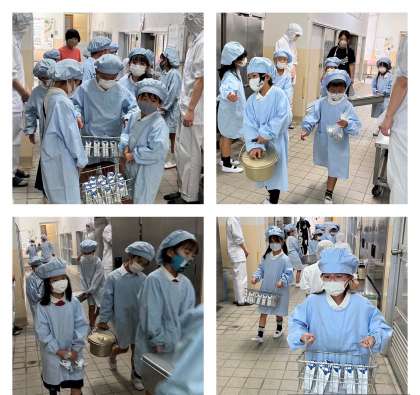 写真は給食を運んでいる給食当番の様子です。