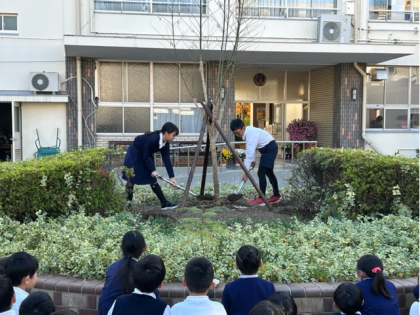 新しい、湯里小学校の玄関のシンボルツリーのお披露目式です。風もなく良いお天気でよかったです。