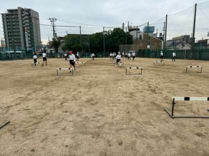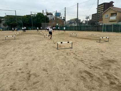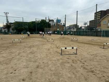 今日初めて40Mのコースを作り、リズムよく、歩数を揃えて跳ぶ練習をしました。